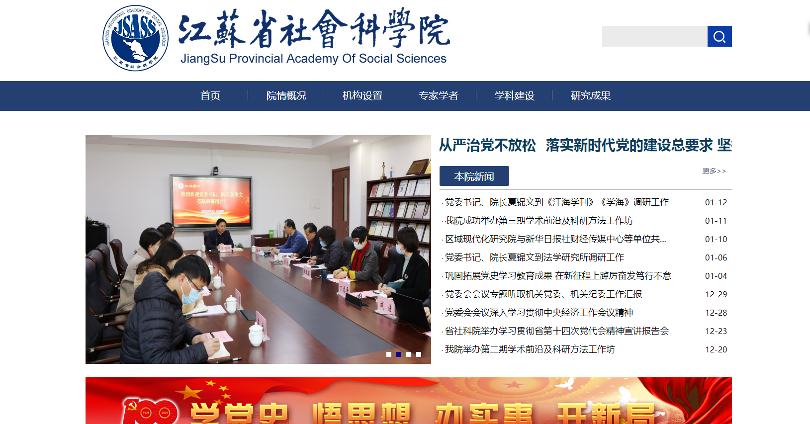 江蘇省社會科學院為江蘇省人民政府直屬事業單位,是從事哲學社會科學研究、經濟社會發展決策咨詢服務的專門機構,是省委、省政府的思想庫和智囊團。夏錦文同志現任江蘇省社會科學院黨委書記、院長,陳愛蓓同志任副院長,王月清同志任黨委委員、副院長,孫功謙同志任黨委委員、副院長。
